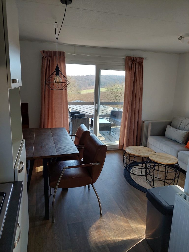 Als u de auto bij het chalet parkeert, geniet u direct van het uitzicht naar het Heuvellandschap. Via het terras, slechts 1 stap omhoog, loopt u naar de schuifpui. De woonkamer met open keuken is een sfeervolle ruimte met een modern interieur, geschikt voor 4 tot 5 personen. Het zitgedeelte heeft een ruime opzet en de eettafel met vaste bank en twee stoelen is een fijne plek om gezellig samen te zitten.