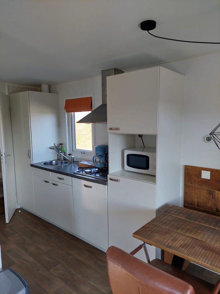 De keuken in wandopstelling biedt genoeg comfort om een heerlijk ontbijt, de lunch of het avondeten te maken. Boven de koelkast met vriesvak staat een magnetron en verder zijn er een gaskookplaat, afzuigkap en vaatwasser ingebouwd.