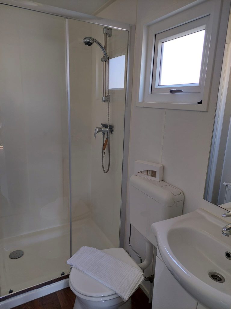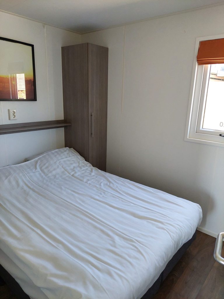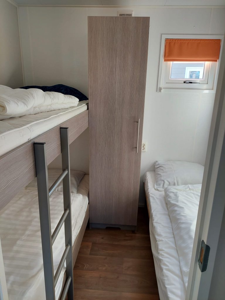 Aan de achterzijde zijn de slaapkamers; twee in totaal. De grootste slaapkamer is ingedeeld met een tweepersoonsbed en de andere slaapkamer staan een los bed en een stapelbed. Vanuit het halletje is de badkamer met een goede douche, toilet, wastafelmeubel en handdoekenradiator te bereiken.