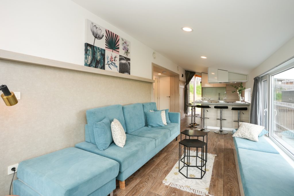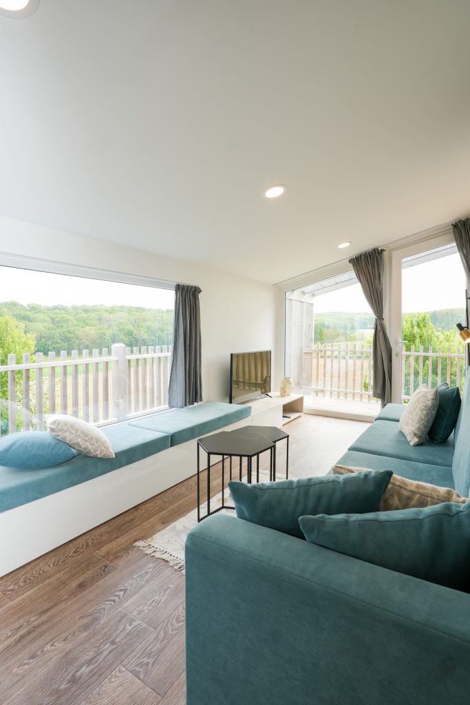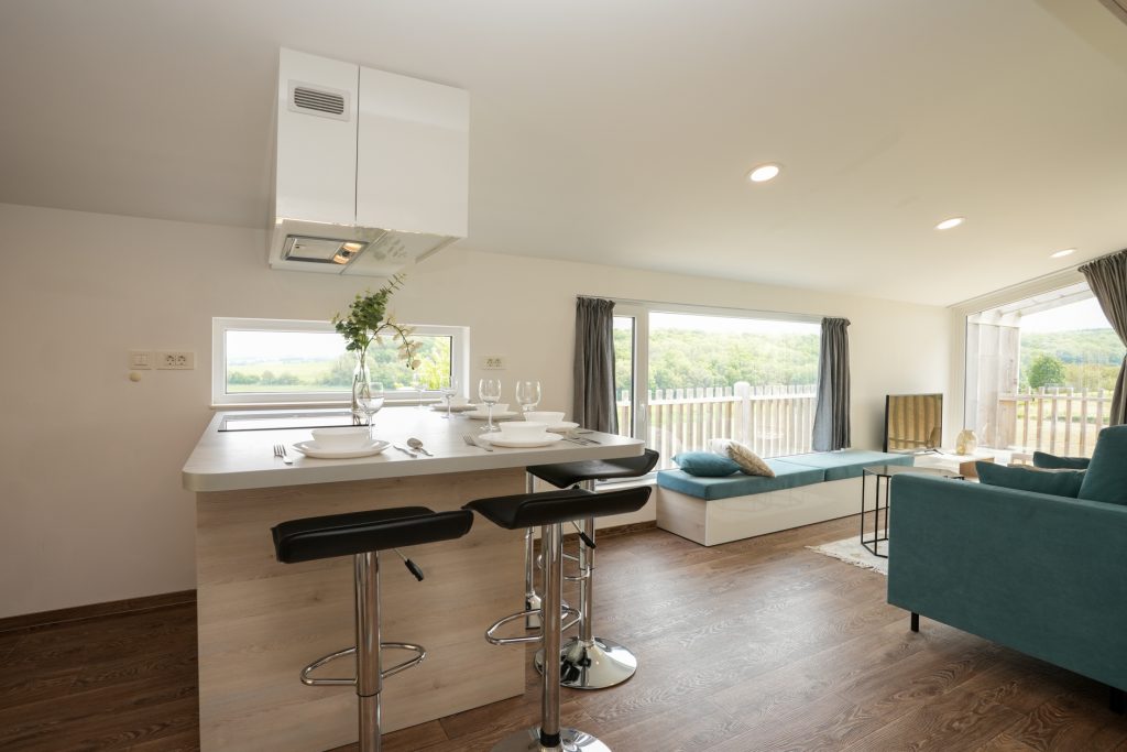 Parkeer de auto voor de deur en loop via de brede trap naar de entree van deze moderne, luxe recreatiewoning. Via de hoge, donkergrijze deur stapt u de woonkamer met open keuken in. Door de grote ramen heeft u aan twee zijden prachtig uitzicht naar het hellingbos. Het schuine plafond versterkt het gevoel van ruimtelijkheid en de op maat gemaakte meubels geven de woonkamer veel sfeer.