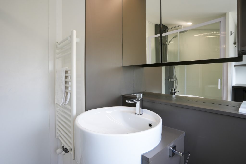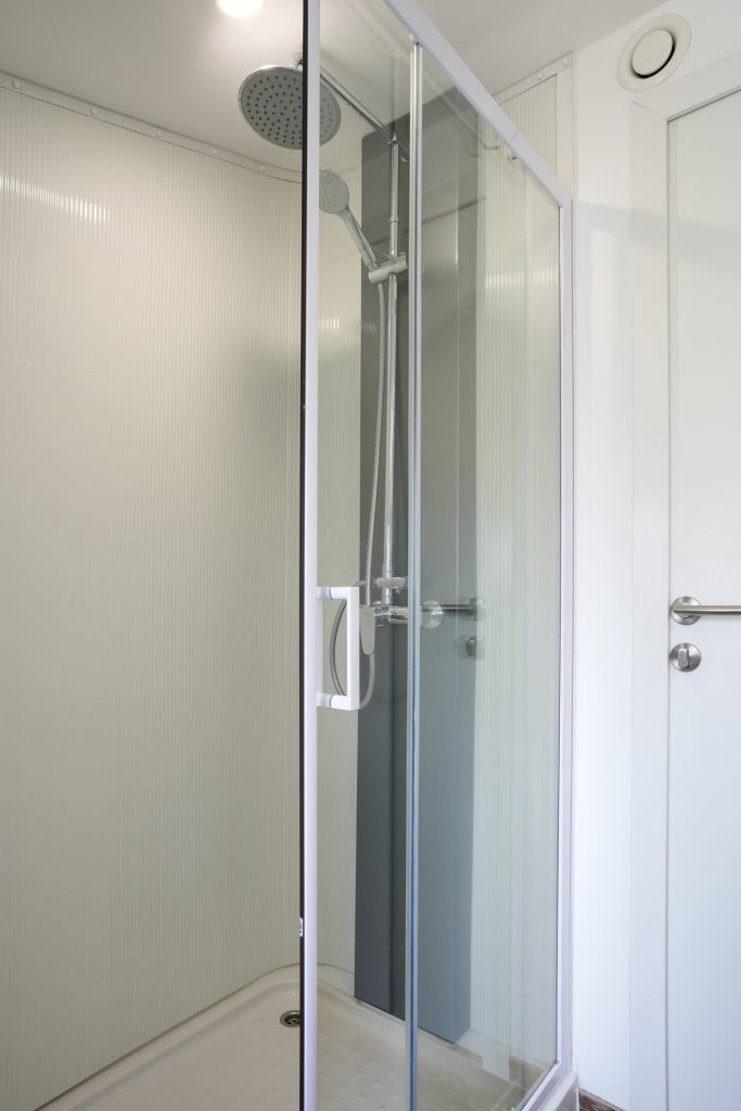 Tussen de slaapkamers is de badkamer gesitueerd waar door de ramen met ondoorzichtig glas veel licht naar binnen valt. De badkamer is ingedeeld met een grote douche, toilet en een ronde wastafel. Aan de linkerzijde hangt een grote handdoekenradiator en de vaste kasten bieden genoeg ruimte voor uw verzorgingsartikelen.