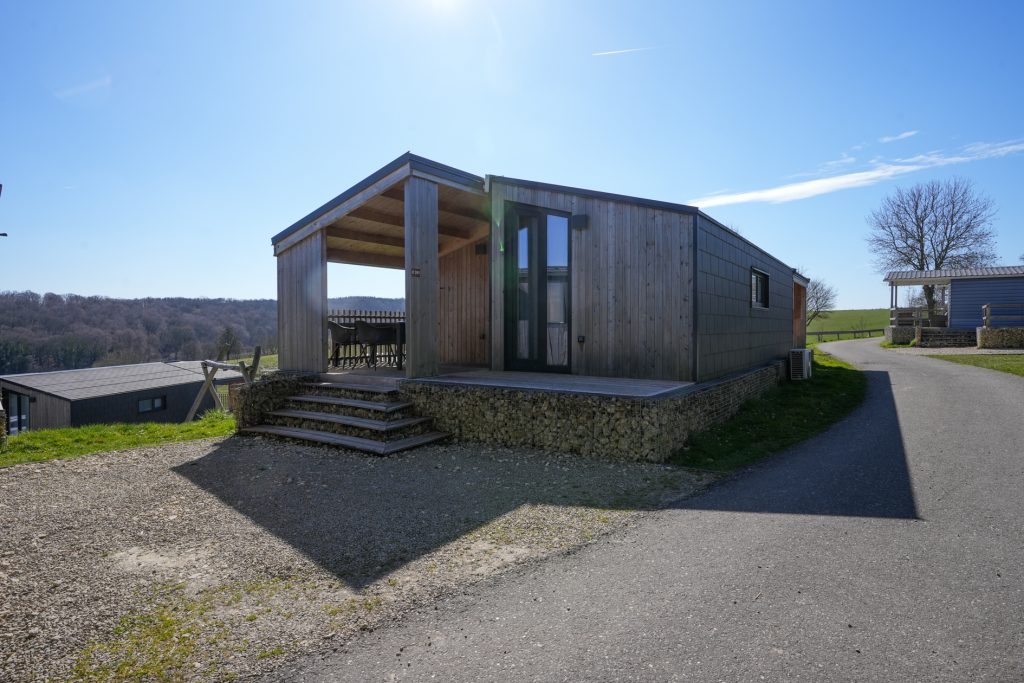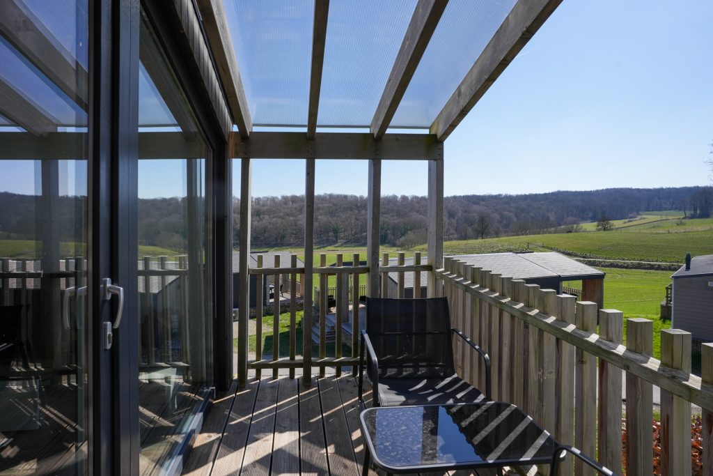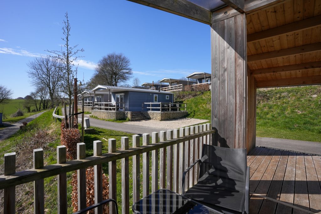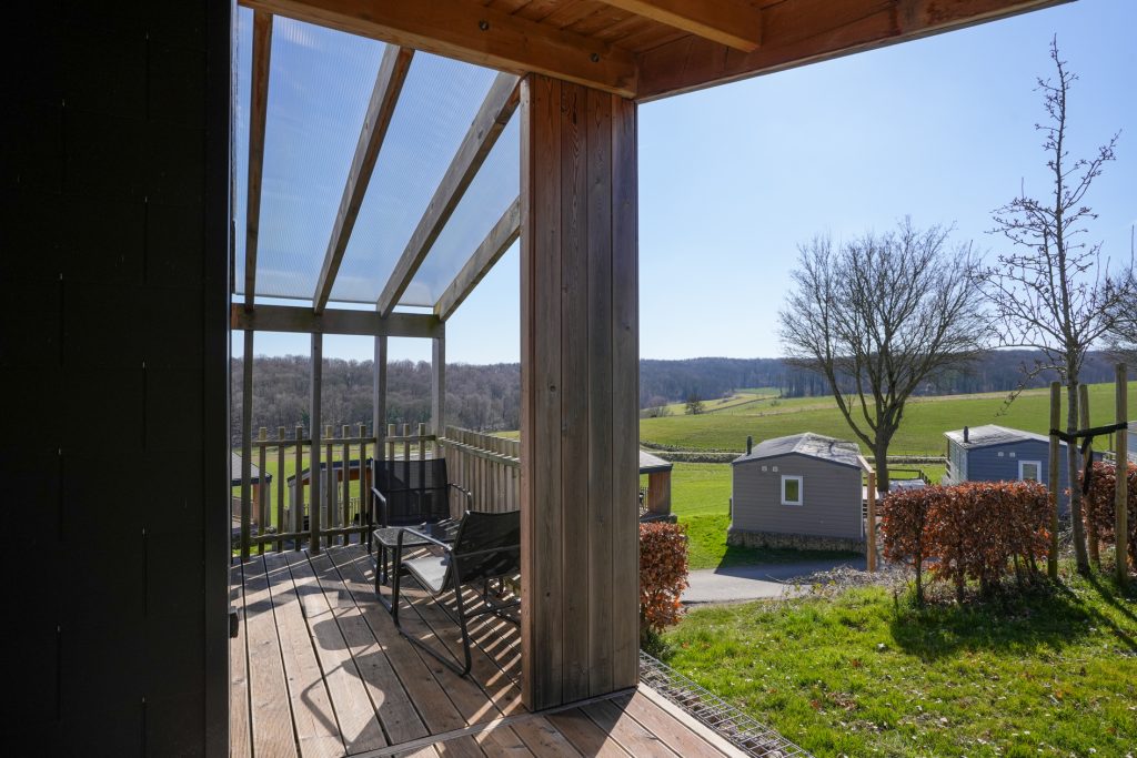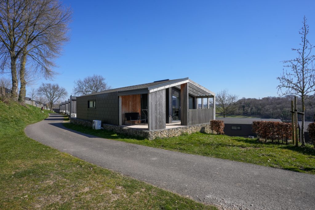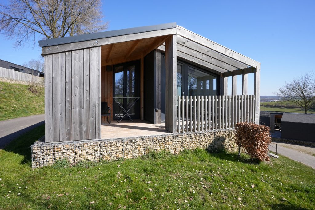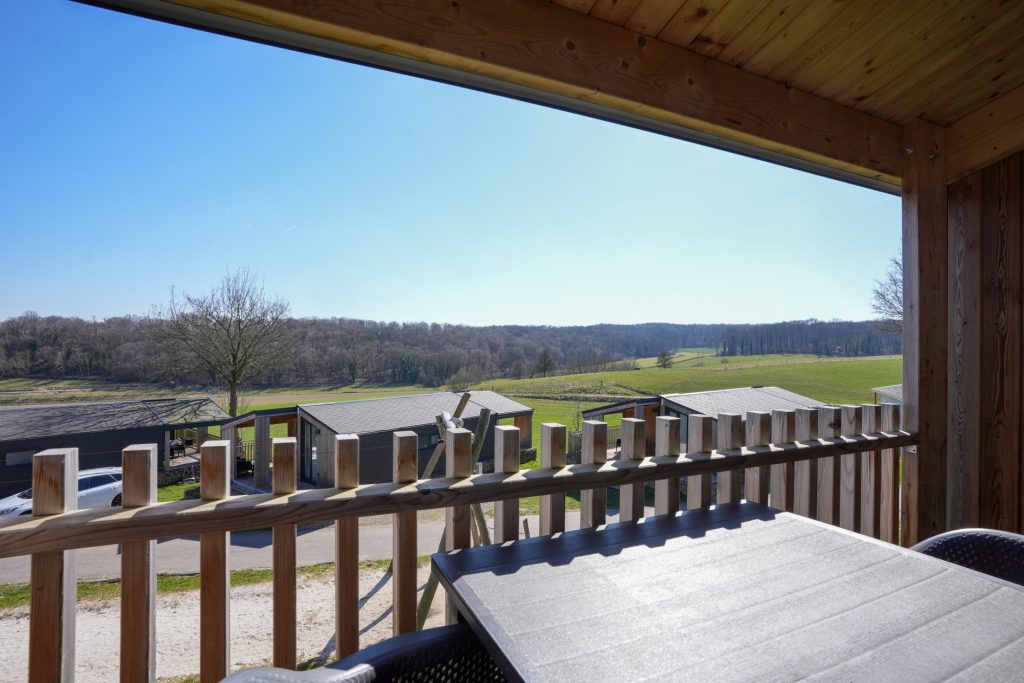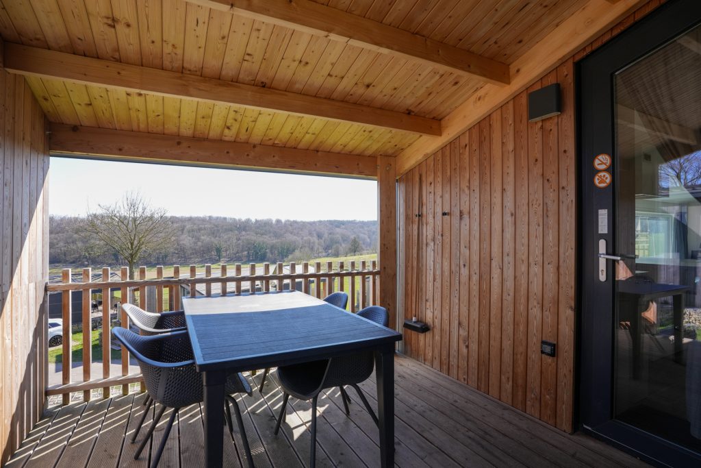 Kenmerkend voor de duurzame woning van het type Panorama Cottage 4 zijn de twee grote, deels overdekte terrassen aan de voor- en achterzijde. Hierdoor kunt u de hele dag buiten zitten, ook als er een zomerse regenbui is. Vanaf het terras aan de achterzijde heeft u fraai uitzicht naar het hellingbos.