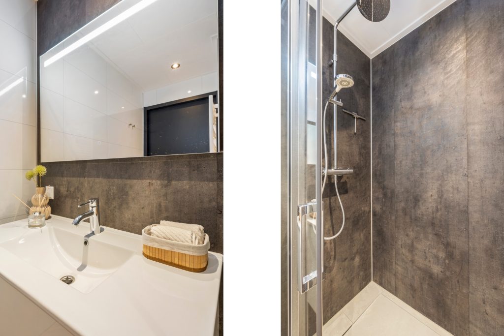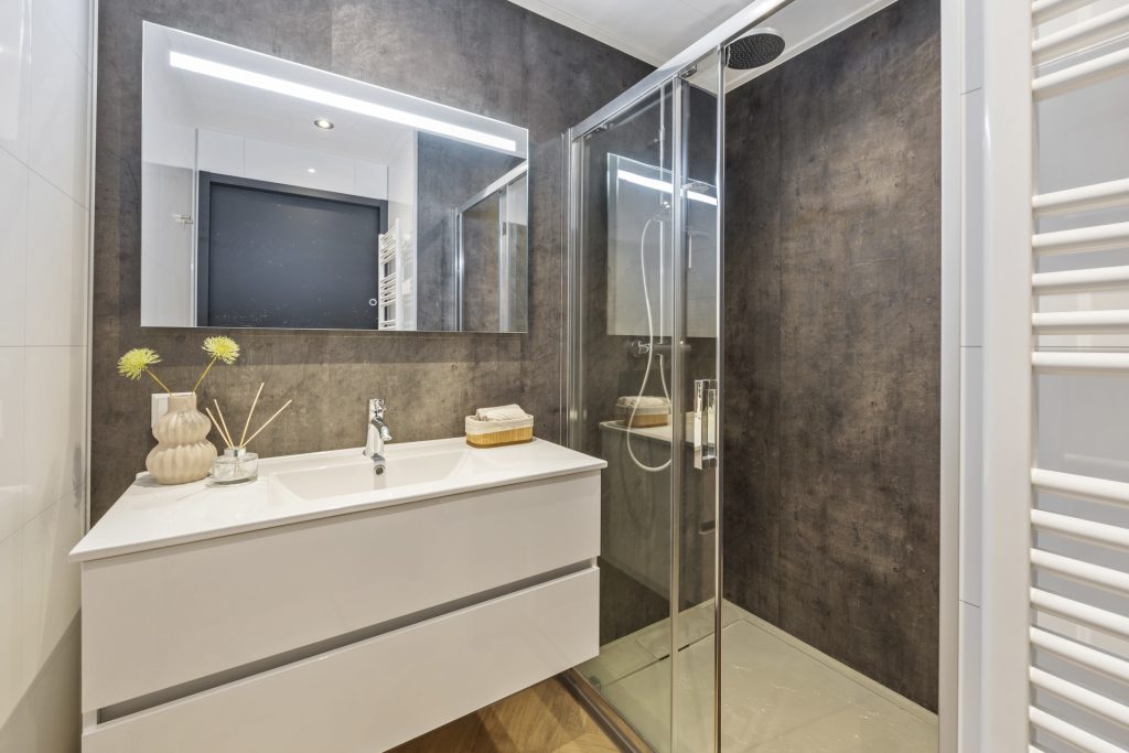 Luxe badkamer met ruime douchecabine , wastafel met badmeubel en designradiator